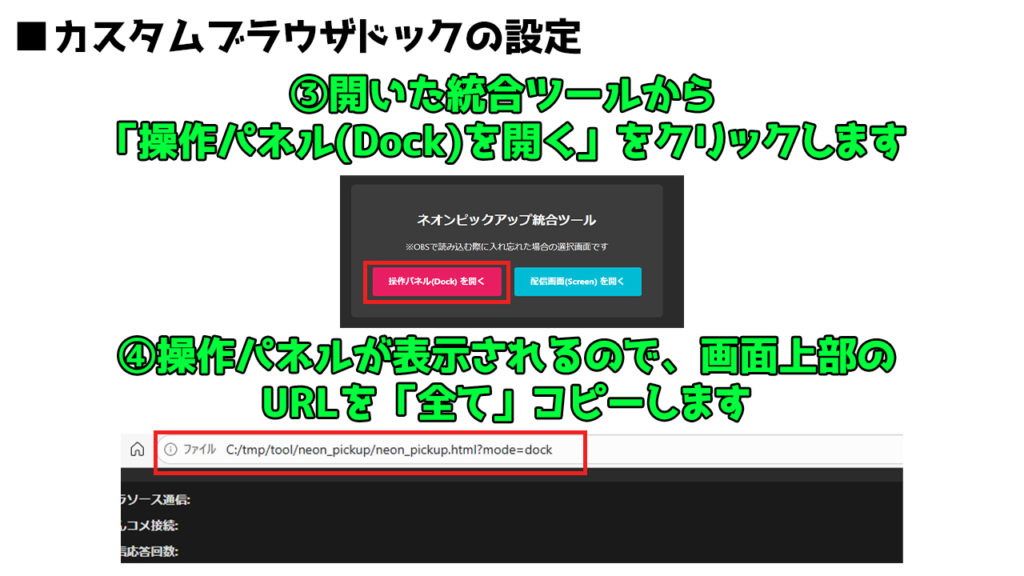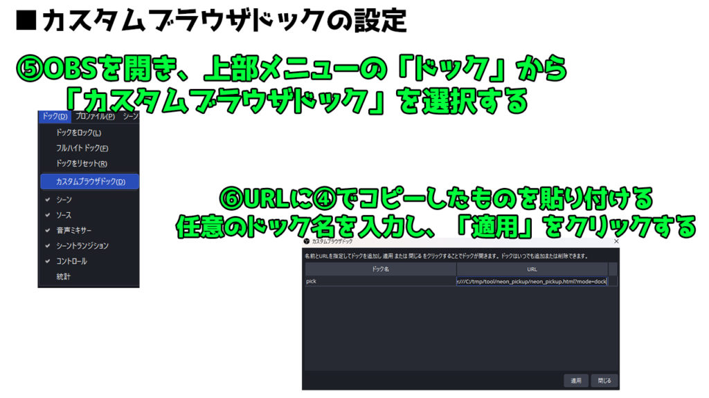 OBSの専用ドックからワンクリックでコメントを表示できるため、